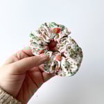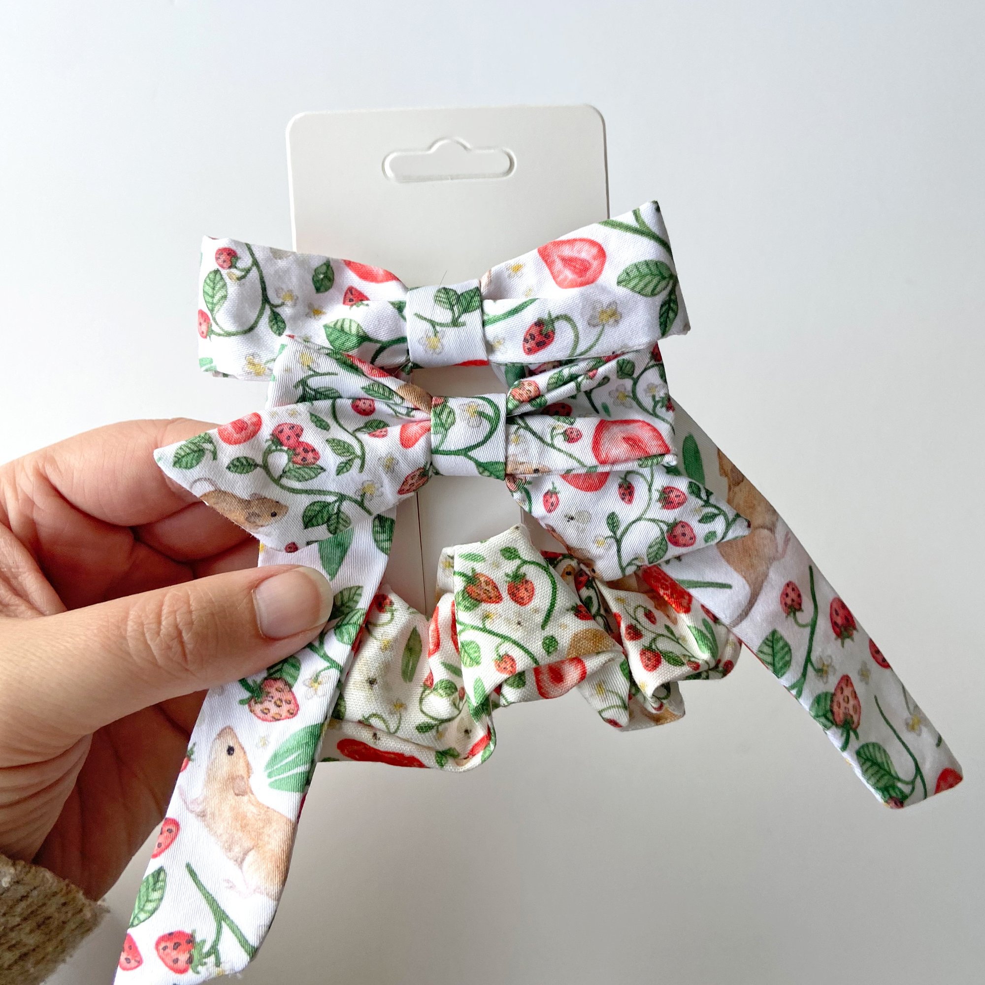 A soft organic cotton satin scrunchie for you and a small and large bow to match.